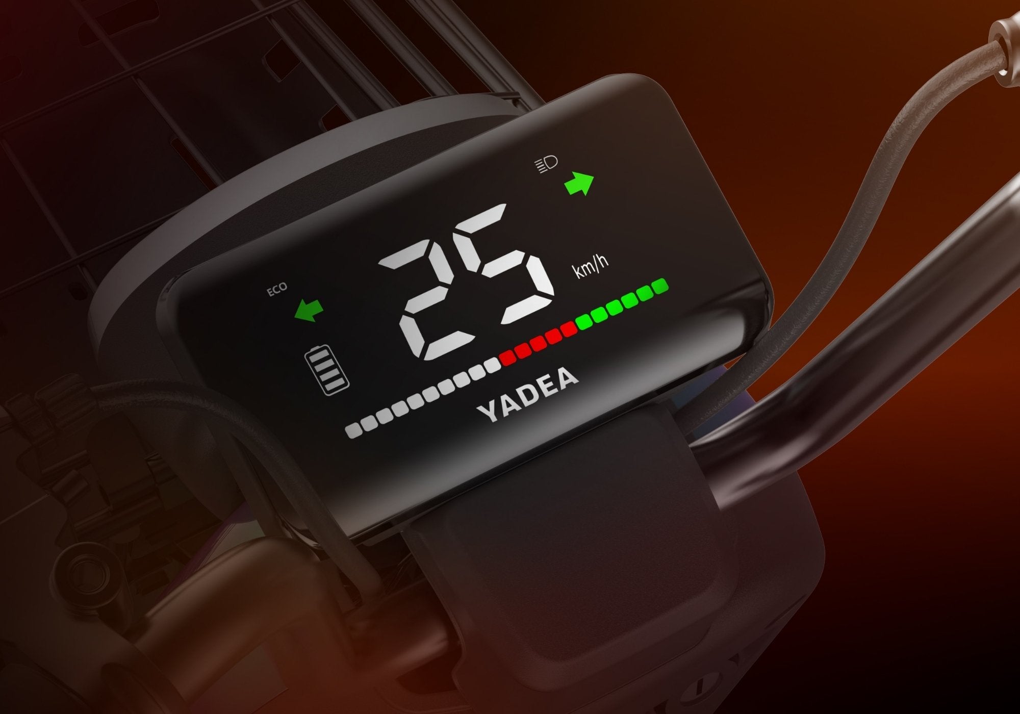 A nagy felbontású HD digitális kijelző kristálytisztán jeleníti meg a legfontosabb adatokat; jelzőfények, sebesség, akkumulátorszint.